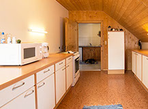 Im angeschlossenen Zubereitungsraum sind 2 Kühlschränke, 1 E-Herd mit Ceranfeld und Heißluft, sowie ein Plattengrill, Kaffemaschine, Mixer, Microwelle, Wasserkocher und auch reichlich Kochgeschirr.