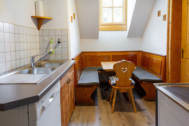In der Küche befindet sich eine Spüle, ein Holzofen sowie eine kleine Eckbank.