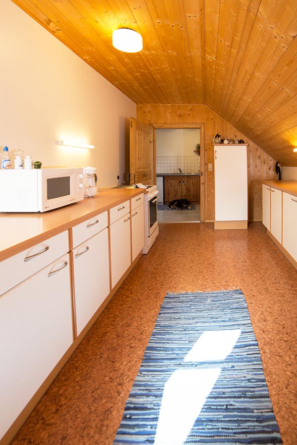 Im angeschlossenen Zubereitungsraum sind 2 Kühlschränke, 1 E-Herd mit Ceranfeld und Heißluft, sowie ein Plattengrill, Kaffemaschine, Mixer, Microwelle, Wasserkocher und auch reichlich Kochgeschirr.